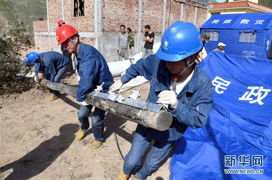 7月16日,在舟曲县南峪乡,国网甘南供电公司抢险人员为临时安置点架设电力设施。 新华社记者 范培珅 摄