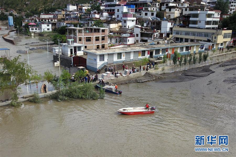 7月16日,在舟曲县南峪乡,当地民兵使用冲锋舟转运救灾物资。 新华社记者 范培珅 摄