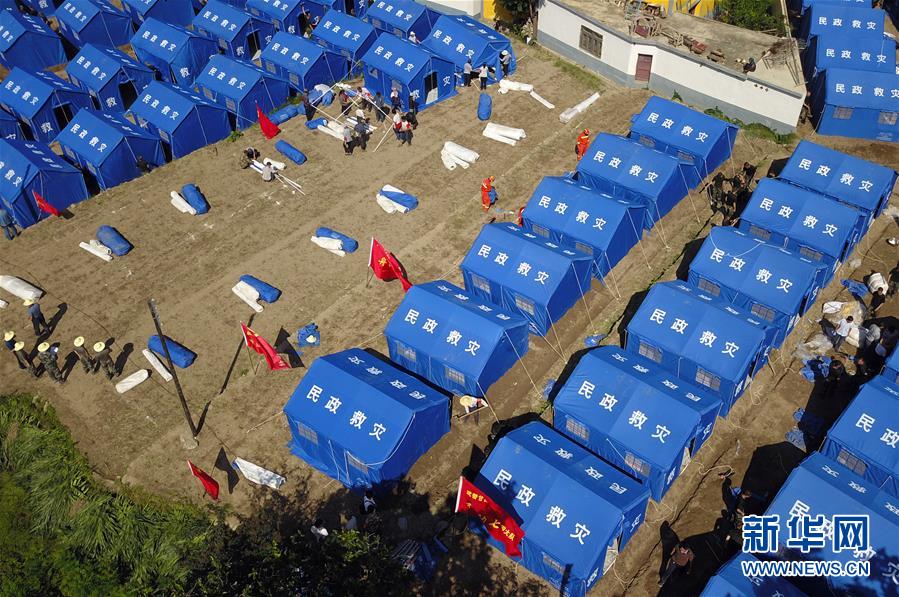 7月16日,在舟曲县南峪乡,抢险应急人员在临时安置点搭建帐篷。 新华社记者 范培珅 摄