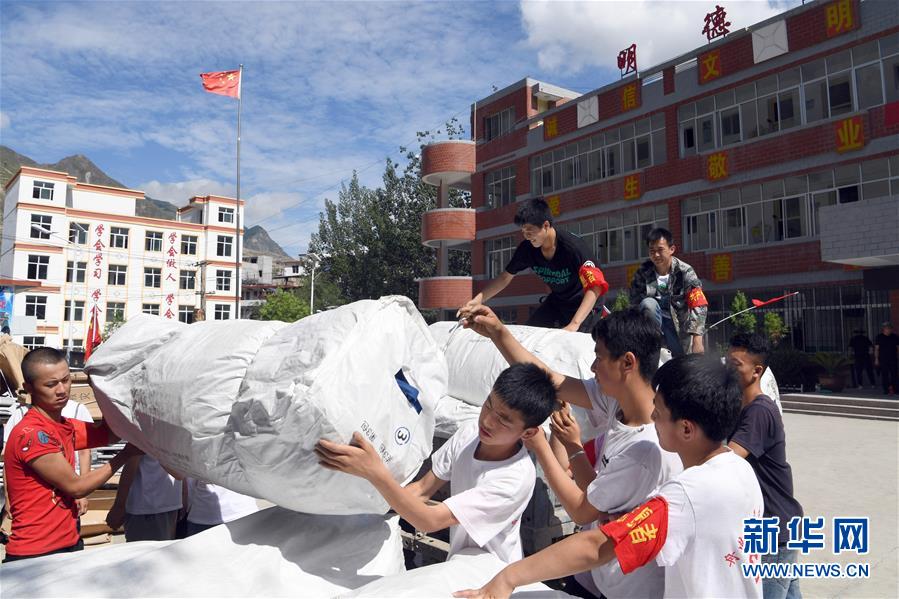 7月16日,在舟曲县南峪乡,志愿者在临时物资转运点搬运救灾物资。 新华社记者 范培珅 摄