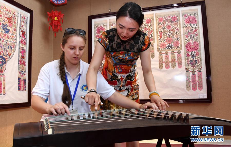 7月17日,来自哈萨克斯坦的萨莎(左)在学习古筝弹奏。当日,第三届上海合作组织青年交流营的营员在青岛参加了一场别开生面的民俗互动体验活动,感受中国传统文化。 新华社记者 李紫恒摄