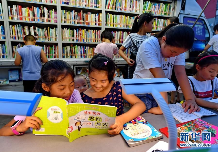 7月16日,唐山市丰南区金都花园社区的小朋友在流动服务车前翻阅图书。
