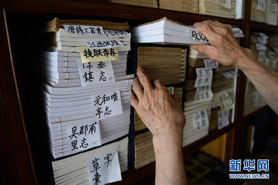 7月18日,江澄波老人在“文学山房”旧书店整理线装书籍。新华社记者季春鹏摄