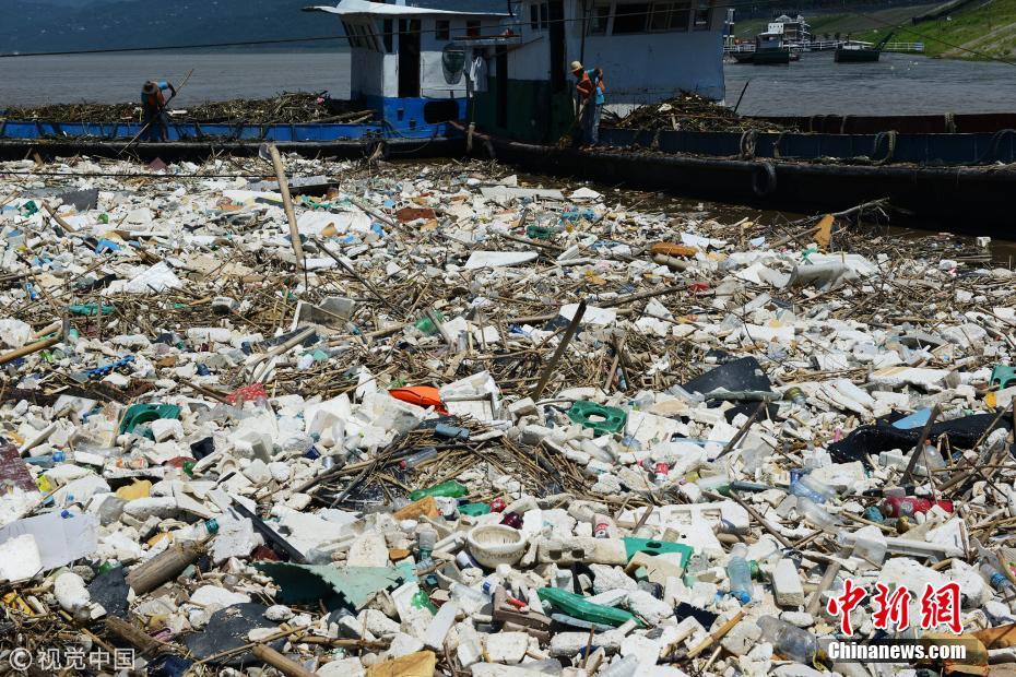 云阳县港务站趸船周围,大量漂浮垃圾围堵集结,环卫工人在高温酷暑中连续奋战。据重庆市环卫局统计,受上游持续强降雨影响,汛期大量漂浮物涌入长江干、支流,库区各地应急清漂预案全面启动,目前投入的船只224艘、人员900多人,日均突击打捞各类垃圾1500余吨。饶国君 摄 图片来源:视觉中国