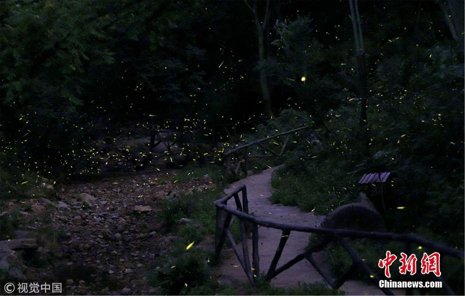 傍晚,随着天气渐暗,当摄影师走进句容宝华山,只见成群结队的萤火虫,在道路旁、山谷间飞舞聚集。绿色的荧光忽明忽暗,一闪一闪,造就出一片梦幻的浪漫奇景。万凌云 摄 图片来源:视觉中国