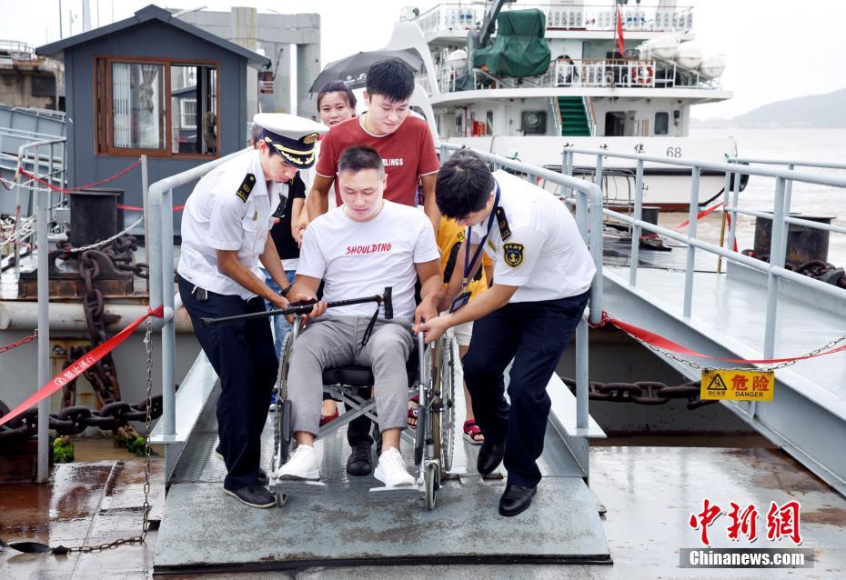 7月21日,海事部门工作人员正在帮助疏散行动不方便者。当日,今年第10号台风“安比”逐步临近浙江沿海区域,宁波、舟山等沿海城市海事部门随即开展巡航检查、人员疏散等工作。同时,大量的渔船纷纷归港避风。中新社发 张长沙 摄