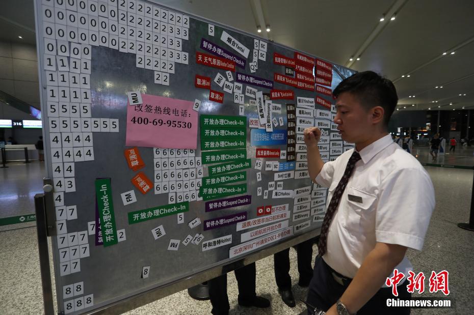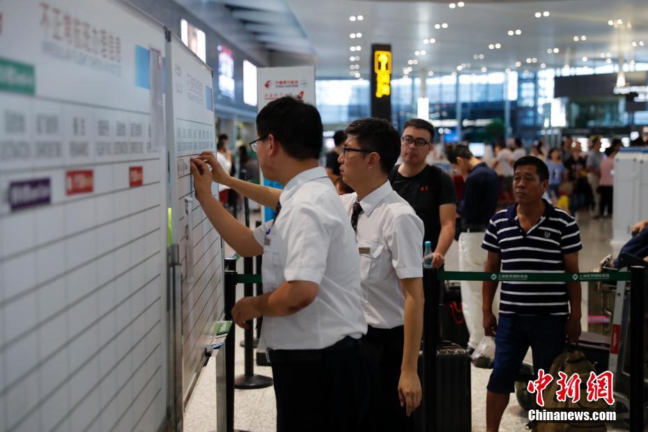 7月22日,工作人员现场更新航班情况。当日,受台风“安比”影响,上海两大机场部分航班取消。上海市气象局22日早间发布,今年第10号台风“安比”将以每小时25公里左右的速度向西北方向移动,预计今天中午前后在上海登陆。