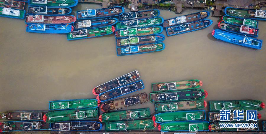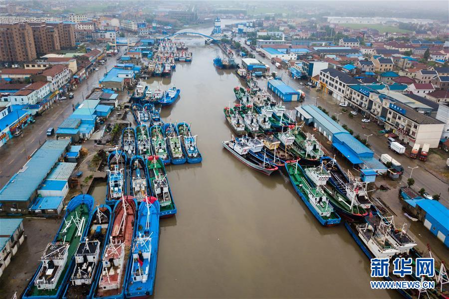 7月22日下午,在江苏省启东市吕四港,大批渔船回港避风(无人机拍摄)。今年第10号台风“安比”当日12时30分在上海崇明岛登陆后,于下午过境江苏省启东市,导致当地出现暴雨、大风等极端天气。 新华社记者李响 摄