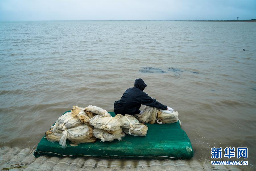 7月22日下午,在江苏省启东市吕四港,一名渔民冒雨在海边捕虾。 新华社记者 李响 摄