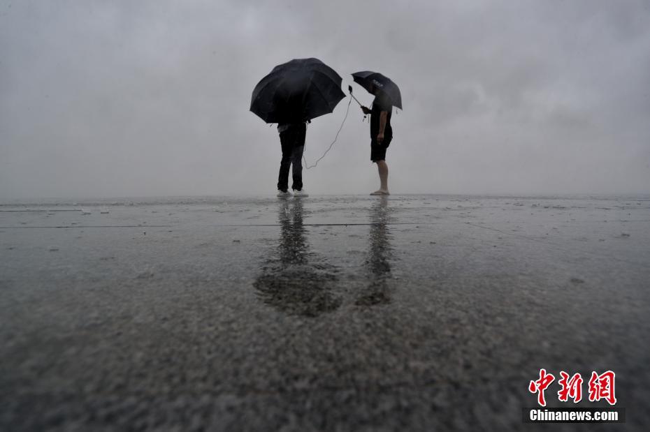 深圳新闻网讯 2018年7月22日,上海。当天上午,受台风“安比”影响,外滩的风雨明显增大,游客的雨伞都吹成了散架或喇叭形。不少游客依旧在观光平台上游览,在难得一遇的台风天里游外滩,别有一番情趣。