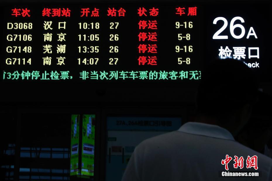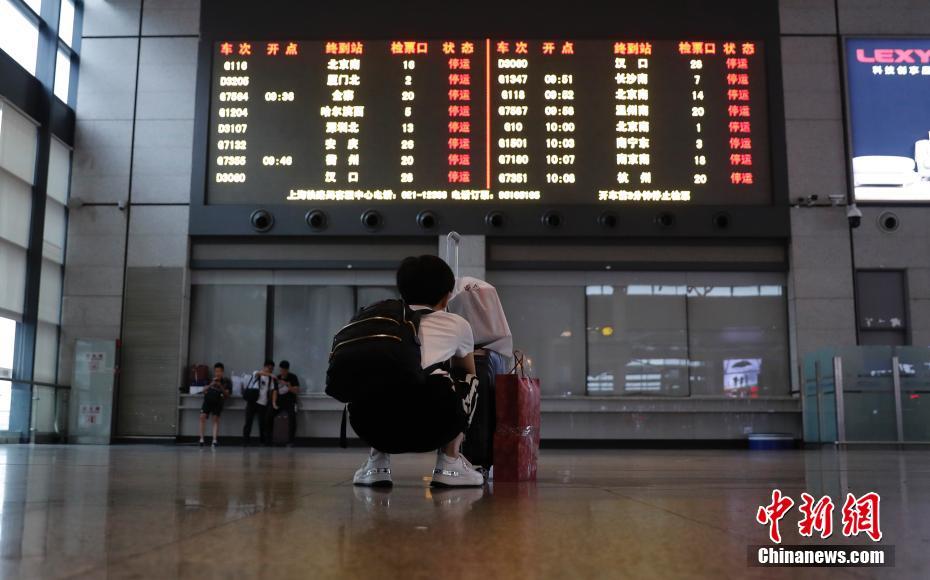 7月22日,乘客在查询高铁列车信息。当日,为了应对台风“安比”,上海停运多趟高铁列车。上海市气象局22日早间发布,今年第10号台风“安比”将以每小时25公里左右的速度向西北方向移动,预计今天中午前后在上海登陆。中新社记者 汤彦俊 摄