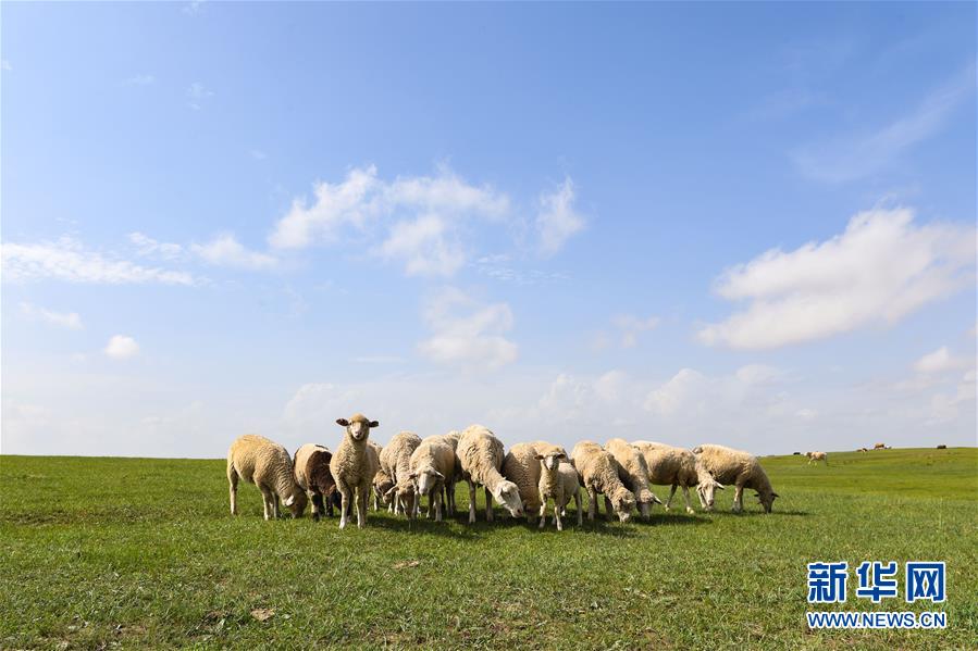 羊群在锡林郭勒盟正蓝旗的草原上觅食(7月16日摄)。盛夏时节,内蒙古锡林郭勒草原一碧千里,遥接天际。蓝天白云之下,牛羊悠闲自在,马群奔驰其中,风光旖旎。 新华社记者 刘磊 摄