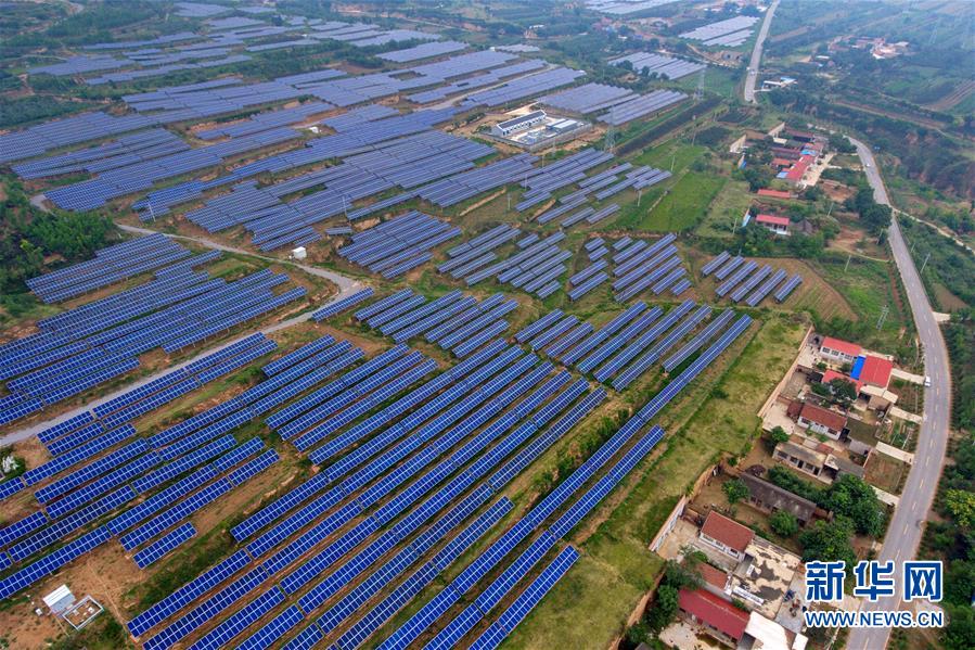 这是7月5日拍摄的山西省运城市芮城县光伏领跑技术基地(无人机拍摄)。近年来,山西省运城市芮城县依托荒山坡地优势,加快发展光伏发电。由国网山西省电力公司、中能建山西电力勘测设计院等共同建设的芮城县光伏领跑技术基地一期项目已全部并网发电,二期项目即将开工建设。该项目总投资88亿元,占地面积近4万亩,总装机容量达102万千瓦。新华社记者曹阳 摄