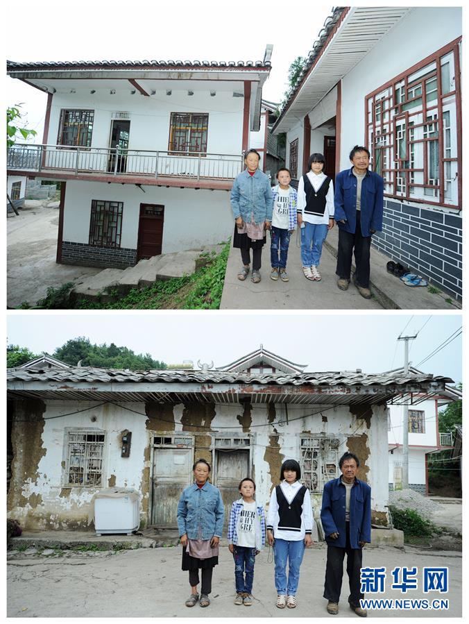 拼版照片:上图为贵州毕节市赫章县河镇乡海雀村村民吴有花(左一)与家人在新修建的住房前合影(7月23日摄);下图为吴有花(左一)与家人在以前的土坯房前合影(7月23日摄)。新华社发杨文斌 摄