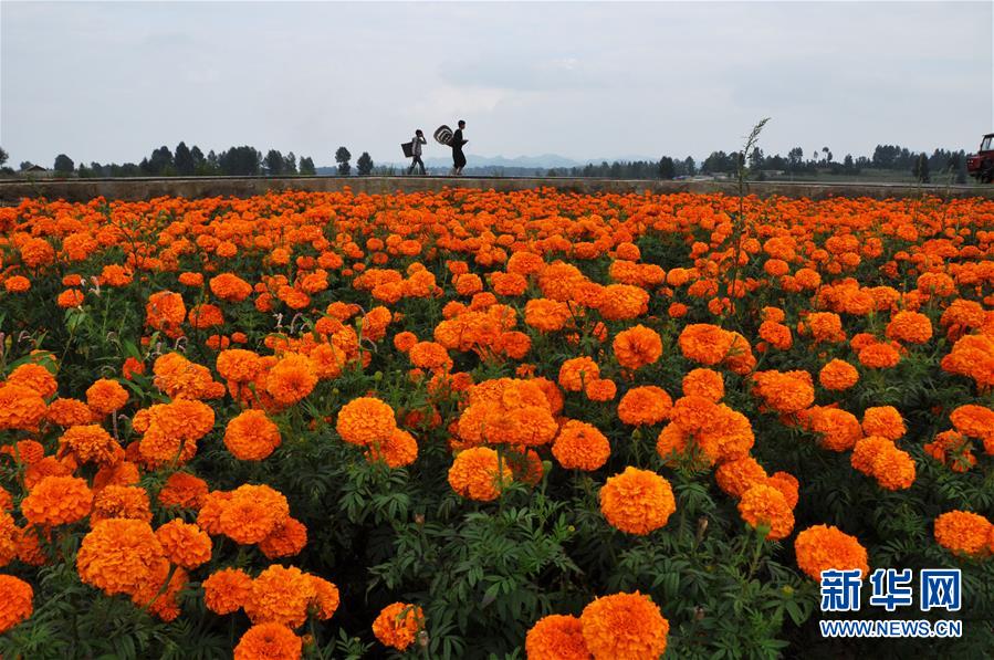 贵州毕节市威宁彝族回族苗族自治县草海镇万寿菊基地一景(2014年8月17日摄)。新华社发 杨文斌 摄