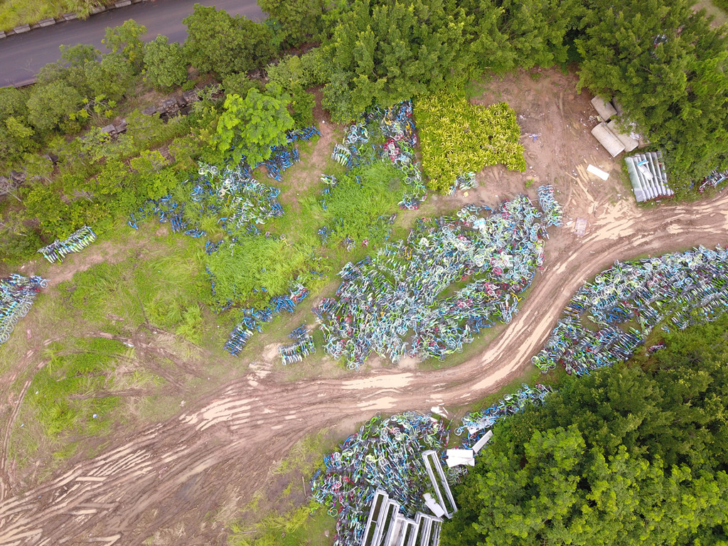 从高空俯瞰,安托山山顶的共享单车堆积无序、且周围杂草丛生,犹如一片共享单车“坟场”