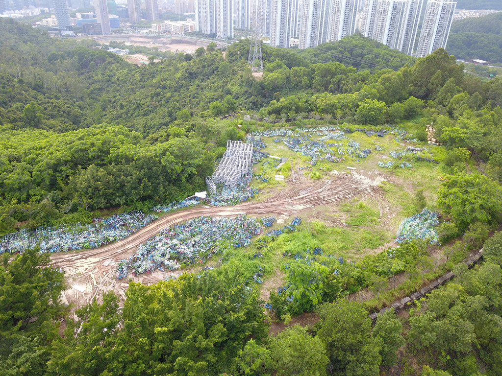 从航拍图中可以看到,山顶空地上单车众多,颜色也各不相同