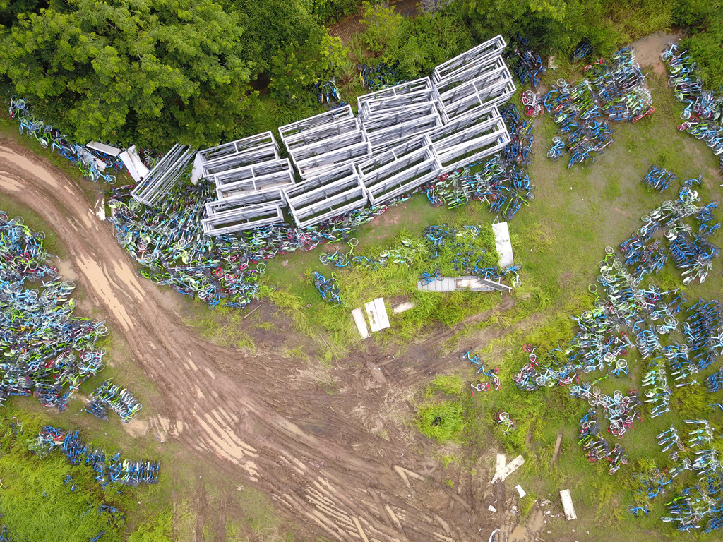 从高空中能够看到,堆放的单车大多为目前无法正常运营的酷骑、小蓝单车