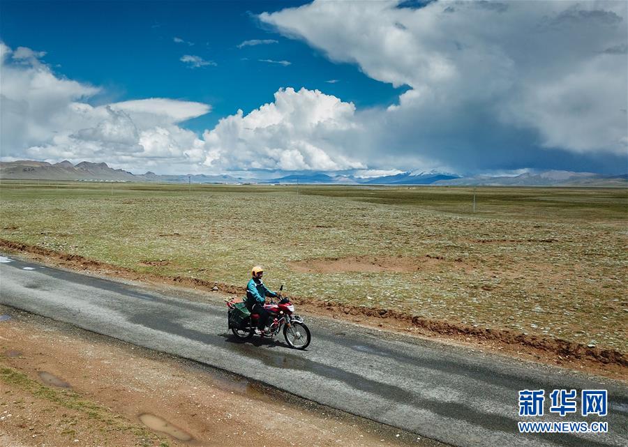 格桑次仁行驶在海拔5500米的高原邮路上(7月27日摄)。新华社记者 李贺 摄