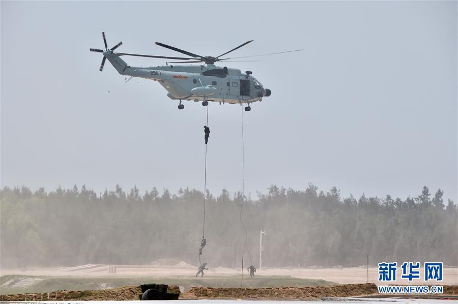 7月29日,在福建泉州赛区开幕式上,中国海军陆战队在三栖立体登陆作战课目军事表演中搭乘舰载直升机滑降。当日,“国际军事比赛-2018”中国承办赛事开幕式分别在新疆库尔勒市和福建泉州市举行。 新华社记者 姜克红 摄