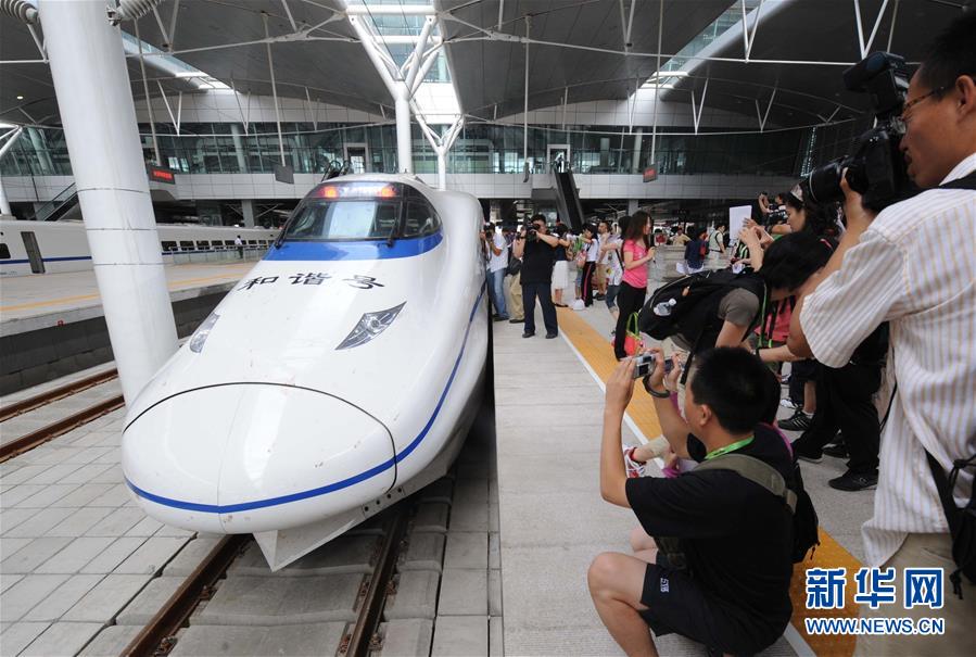 2008年7月31日,京津城际高速铁路正式开通运营前夕,人们在天津站拍摄一辆准备运营的“和谐号”列车。新华社记者 李文摄