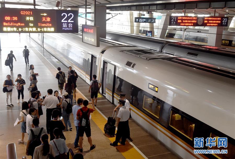 2018年8月1日,在北京南站站台上,乘客准备乘坐北京至天津的城际列车。新华社记者 罗晓光 摄