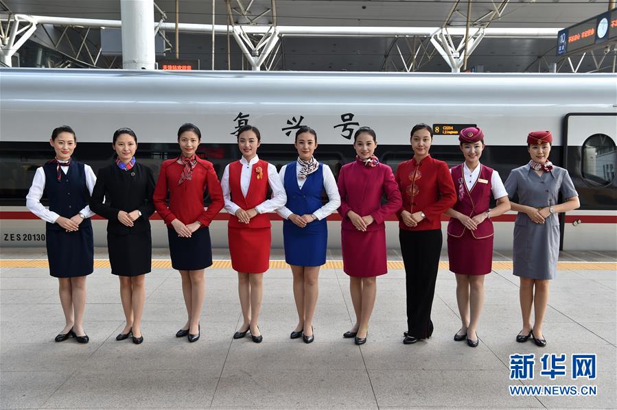 2018年7月18日,在天津站站台上,列车乘务员展示第一至第九套京津城际列车乘务员制服。新华社记者 李然 摄