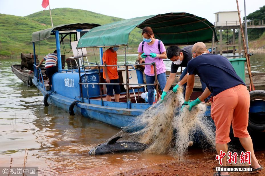 8月1日早晨,濂溪区护豚队接到渔民打来的电话,在湖口县鄱阳湖的屏峰水域,发现水中丝网里有一头江豚,怀疑已死亡。接到电话后,正在芳兰湖清理水中定制网的濂溪区护豚队随即赶到现场。护豚队队员赶到现场时看到,事发地点距离岸边约30米,一头大江豚全身被水中的丝网缠住,无法动弹。见此情况,大家将浑身缠满丝网的江豚连网一起运至岸边,同时与中科院武汉水生生物所取得联系。洪永林 摄 图片来源:视觉中国 文字来源:九江新闻网