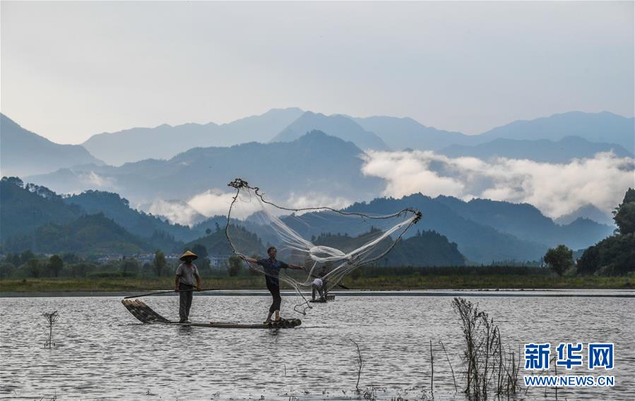 8月1日,淳安县汾口镇红星村的渔民乘着竹排,在千岛湖的支流武强溪上进行撒网捕捞作业。新华社记者 徐昱 摄