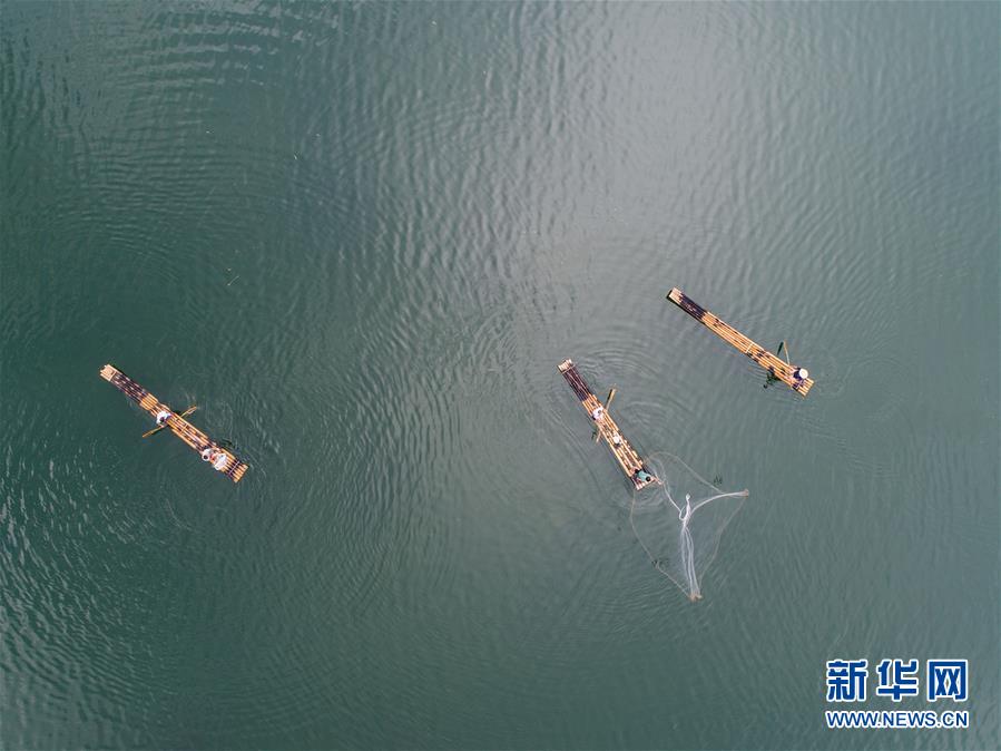 8月1日,淳安县汾口镇红星村的渔民乘着竹排,在千岛湖的支流武强溪上进行撒网捕捞作业(无人机拍摄)。新华社记者 徐昱摄