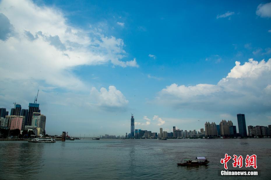 7月14日,一艘渔船停在长江和汉江交汇处,从汉阳南岸嘴望去汉江(左)与长江(右)“泾渭分明”。中新社记者 张畅 摄