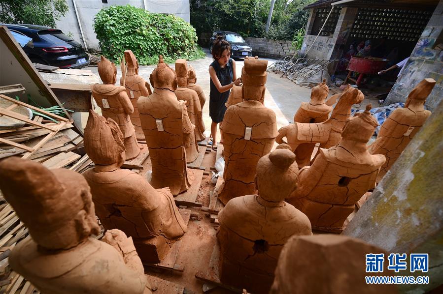 8月6日,朱悦在查看晾制中的泥塑。 新华社记者赵丁喆摄