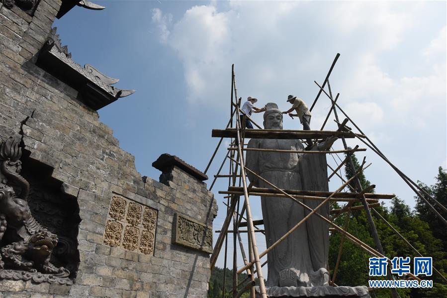 8月6日,许明笙(左)和父亲许良国在制作历史人物塑像。 新华社记者马晶摄