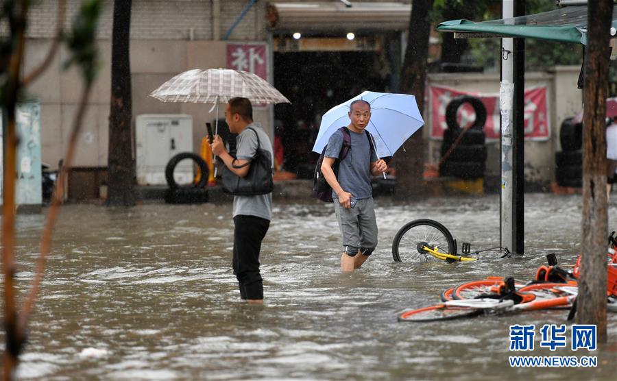 7月24日,在天津市南开区迎水道,路人涉水前行。据中央气象台消息,受台风“安比”影响,23日起至24日早晨,河北东部、天津大部、北京东南部等地出现暴雨。新华社记者李然 摄
