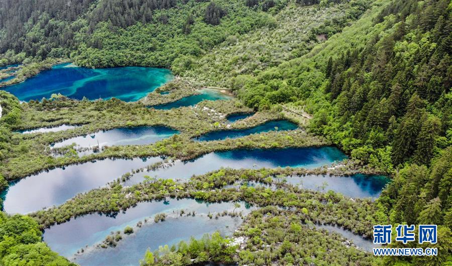 这是九寨沟景区的树正群海景点(5月17日无人机拍摄)。新华社记者薛玉斌 摄