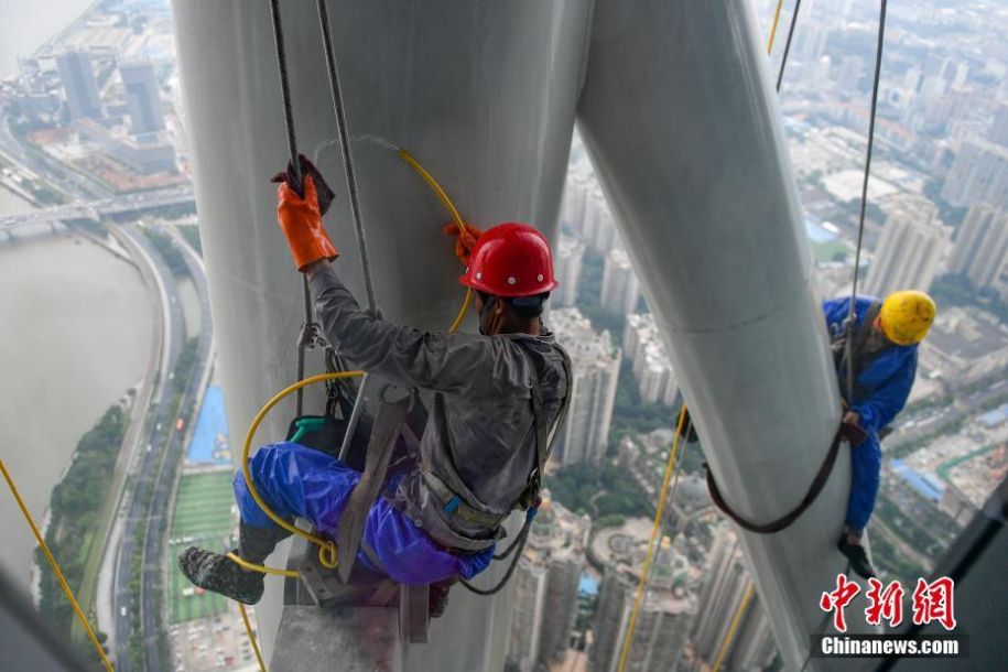 8月3日,两名高空清洁工在400米高空清洗广州塔钢柱。据悉,广州塔定期会对外墙玻璃、钢结构进行清洁,每次清洁耗时一个多月。目前,广州塔聘请了清洁公司为385—450米的东面区钢结构进行清洁工作。中新社记者 陈骥旻 摄