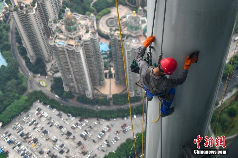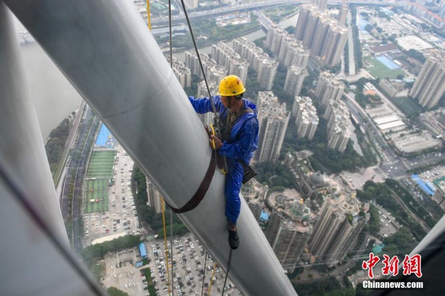 8月3日,两名高空清洁工在400米高空清洗广州塔钢柱。据悉,广州塔定期会对外墙玻璃、钢结构进行清洁,每次清洁耗时一个多月。目前,广州塔聘请了清洁公司为385—450米的东面区钢结构进行清洁工作。中新社记者陈骥旻 摄
