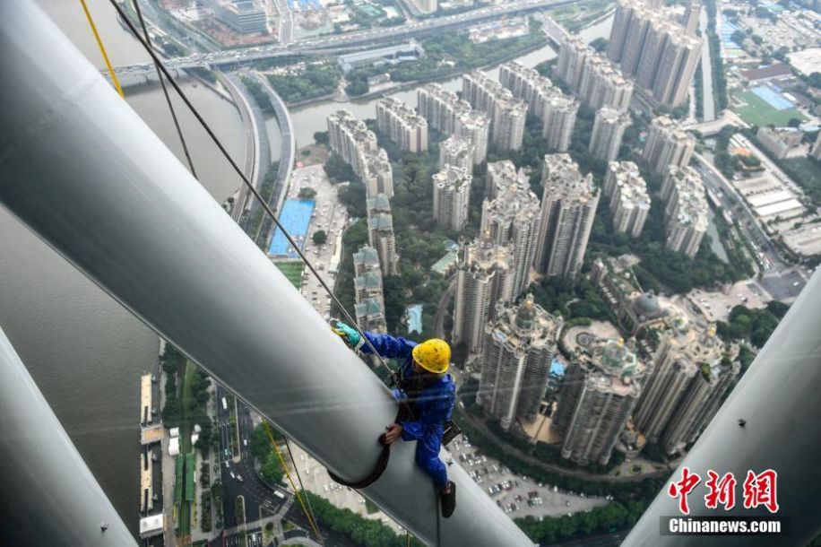 清洁工400米高空变身“蜘蛛侠” 炎炎盛夏中擦亮广州塔