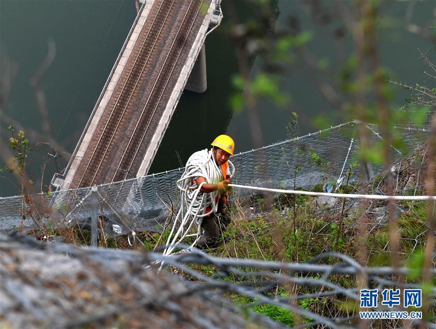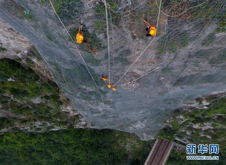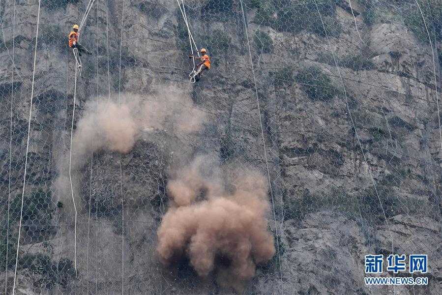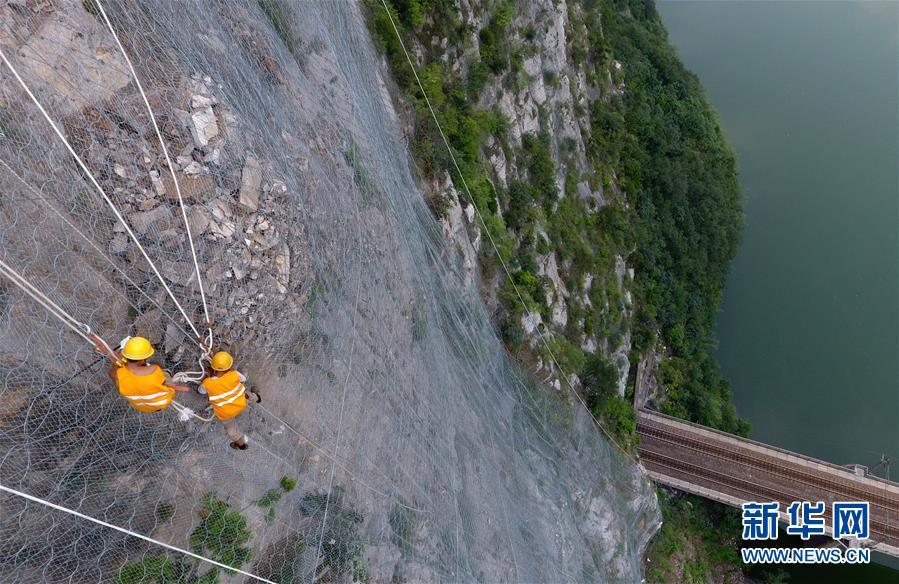 8月9日,抢险人员在侯月铁路柏枝隧道上方悬崖进行碎石作业。 新华社记者李嘉南摄