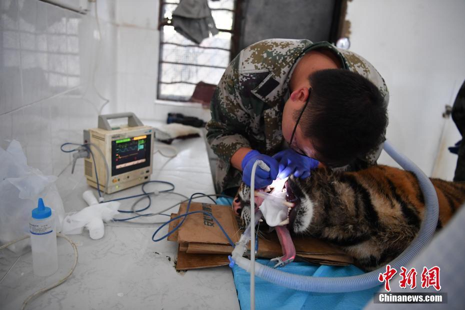 8月9日,兽医使用洗牙机为老虎洗牙。当日,位于昆明的云南野生动物园兽医通过呼吸麻醉的方式,为园中一只一岁的老虎清洁牙。中新社记者 刘冉阳 摄