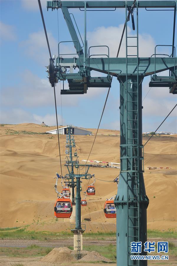 游客在库布其沙漠中的内蒙古鄂尔多斯市达拉特旗响沙湾景区的沙地上荡秋千(7月31日摄)。依托库布其沙漠特有的自然风光和多年生态建设的成果,当地建成响沙湾、七星湖、恩格贝等生态旅游景区。近十年来,鄂尔多斯市生态旅游景区累计接待游客近1000万人次,实现收入24.6亿元。