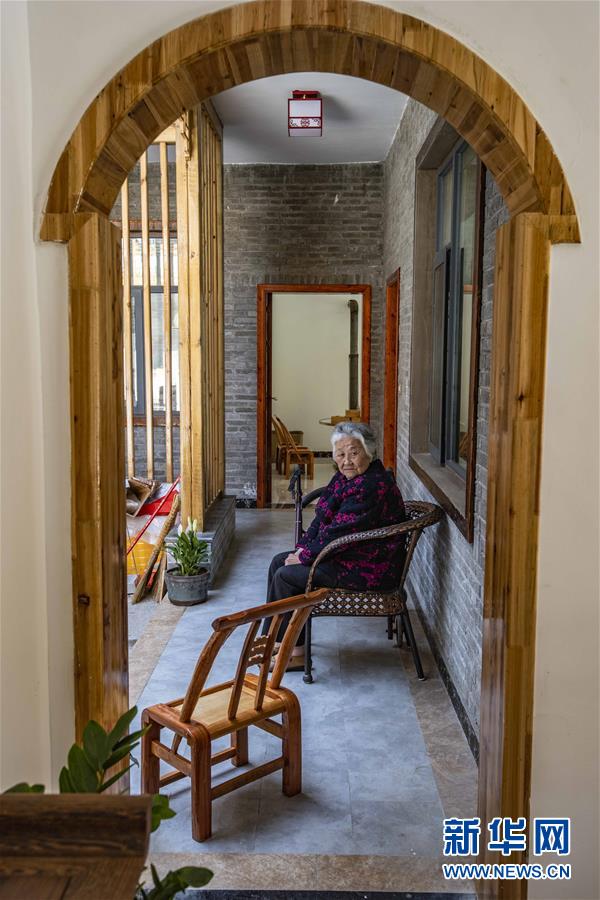 一名堰河村老人在新入住的民居的回廊休息(5月13日摄)。