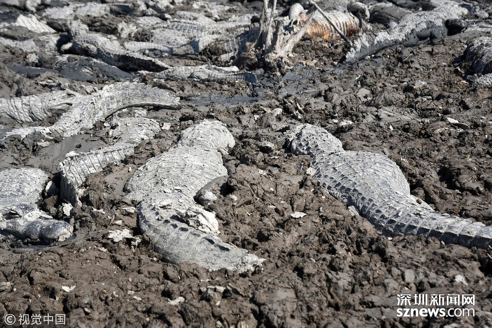 当地时间2016年8月15日,巴拉圭查科,当地近日来遭遇严重干旱,地面龟裂,数以百计的凯门鳄因干旱死亡,引得众多秃鹫进食。