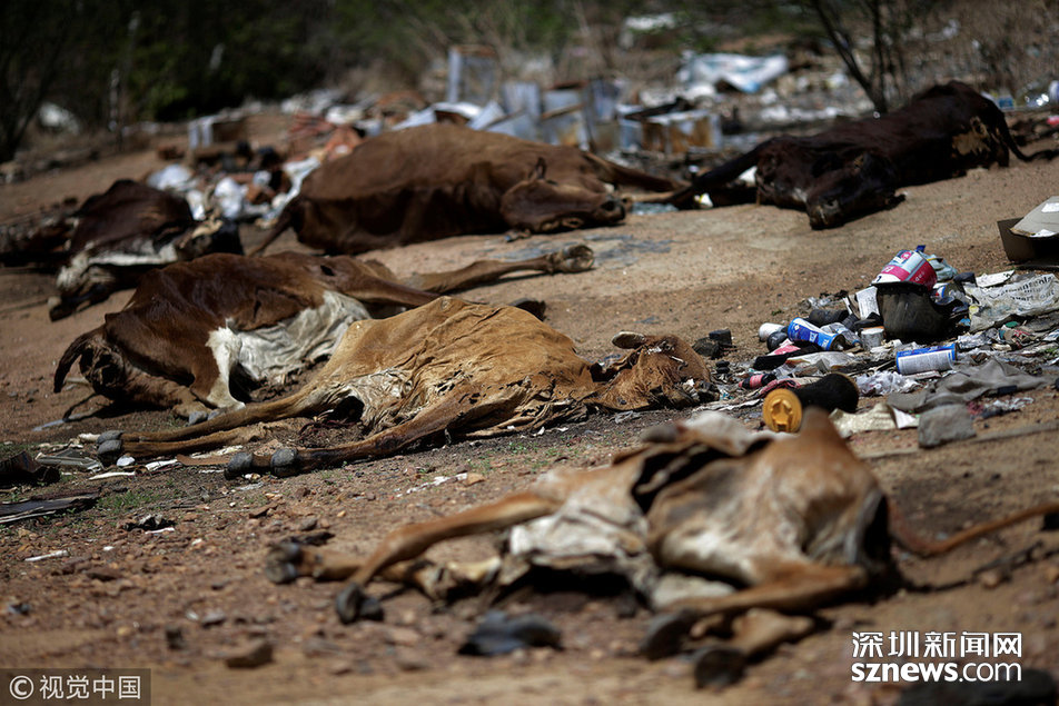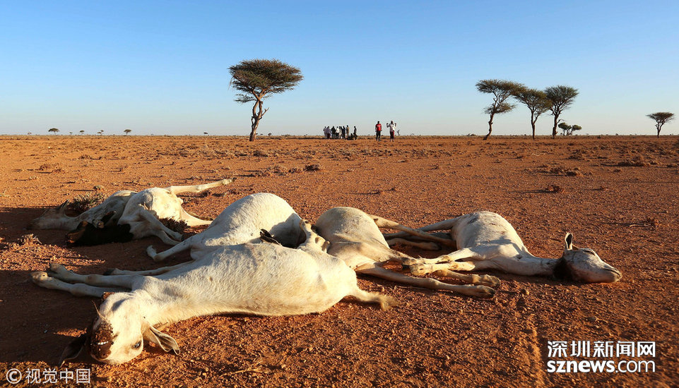 当地时间2016年12月15日,索马里邦特兰,干旱的土地上散布着羊的尸体。当地遭遇干旱天气,牲畜受到危害。