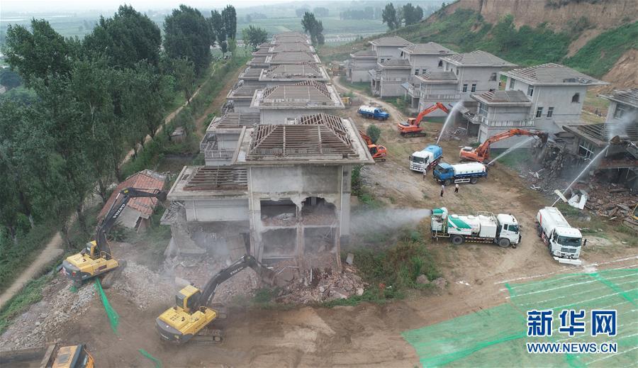 8月14日,大型机械对西安市鄠邑区蒋村镇的违建别墅进行拆除(无人机拍摄)。新华社记者 邵瑞 摄