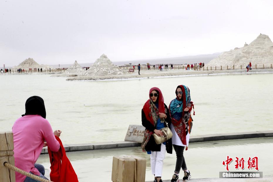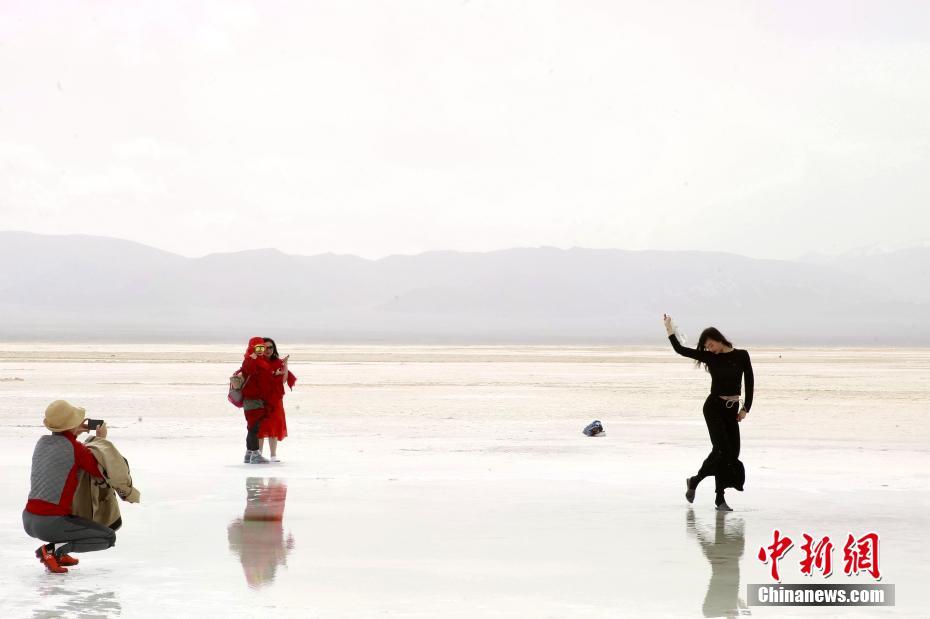 4月26日,历经6个月封闭升级改造的青海茶卡盐湖开始迎客,游客踏入卤水湖及盐雕群,畅享中国版“天空之镜”。图为游客在盐湖拍照。中新社记者 张添福 摄