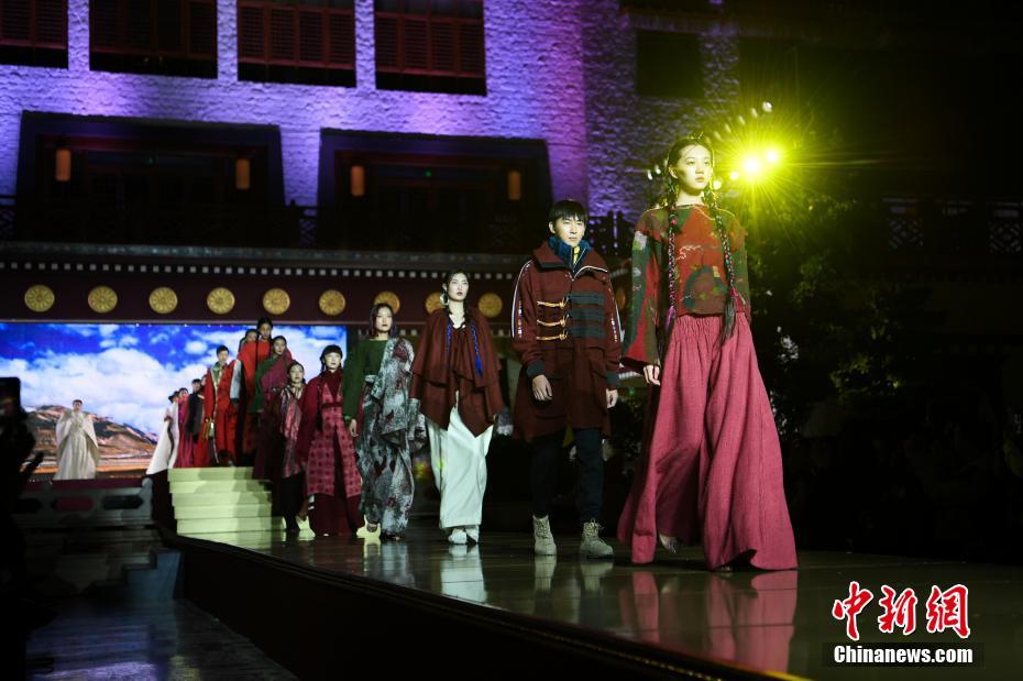 8月12日晚,由西藏职业技术学院与北京服装学院共同打造的“净美雪顿·美好生活”西藏民族服装与服饰展演活动在拉萨举行。现场通过传统篇、现代篇与未来篇三个篇章,展演了藏族传统服装26套,设计创新服装58套,共计84套服装。图为模特展示藏族传统服饰。中新社记者何蓬磊 摄