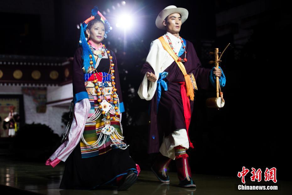 8月12日晚,由西藏职业技术学院与北京服装学院共同打造的“净美雪顿·美好生活”西藏民族服装与服饰展演活动在拉萨举行。现场通过传统篇、现代篇与未来篇三个篇章,展演了藏族传统服装26套,设计创新服装58套,共计84套服装。图为模特展示藏族传统服饰。中新社记者何蓬磊 摄