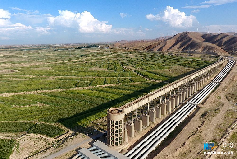 宁夏红寺堡扬水工程三泵站压力管道和岀水渡槽。新华网 张洁龙 摄