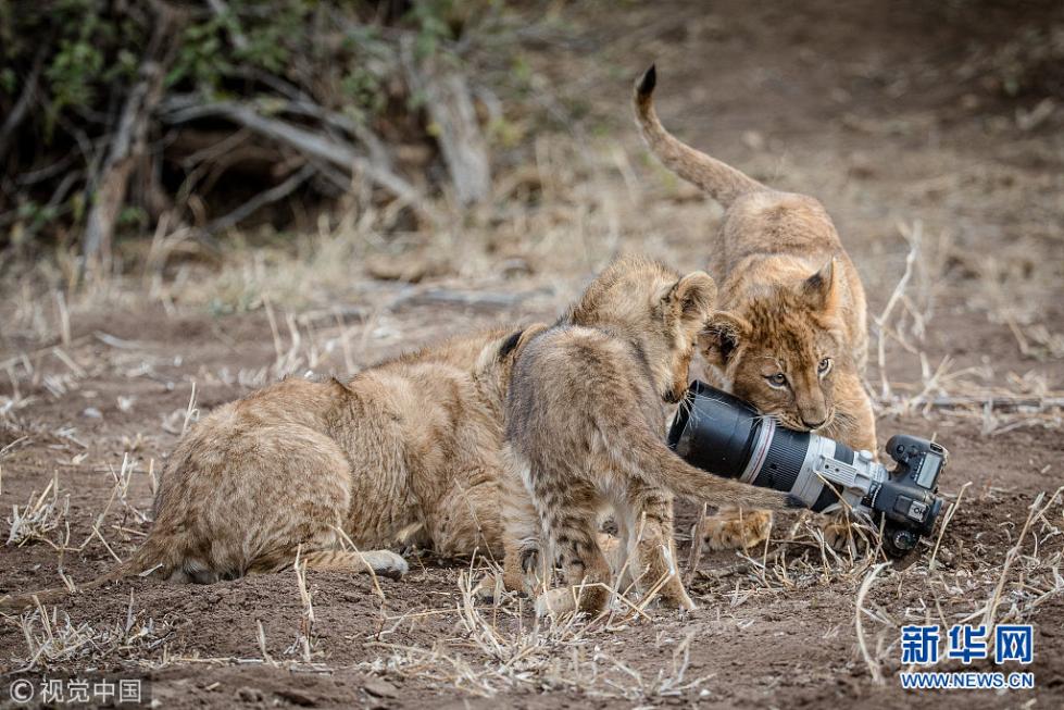 近日,非洲博茨瓦纳马沙图野生动物保护区内一头狮子叼起摄影师掉落在地上的相机,之后还将相机交给小狮子们玩耍,看起来十分好奇,而摄影师非常无奈。现年57岁的丛林探险家Barbara Jensen Vorster在一辆越野车上为马沙图野生动物保护区的狮群拍照时,相机不小心掉到了地上。砰的一声响惊动了母狮子,它向摄影师方向移动,迫使探险队撤退。(图片来源:视觉中国)